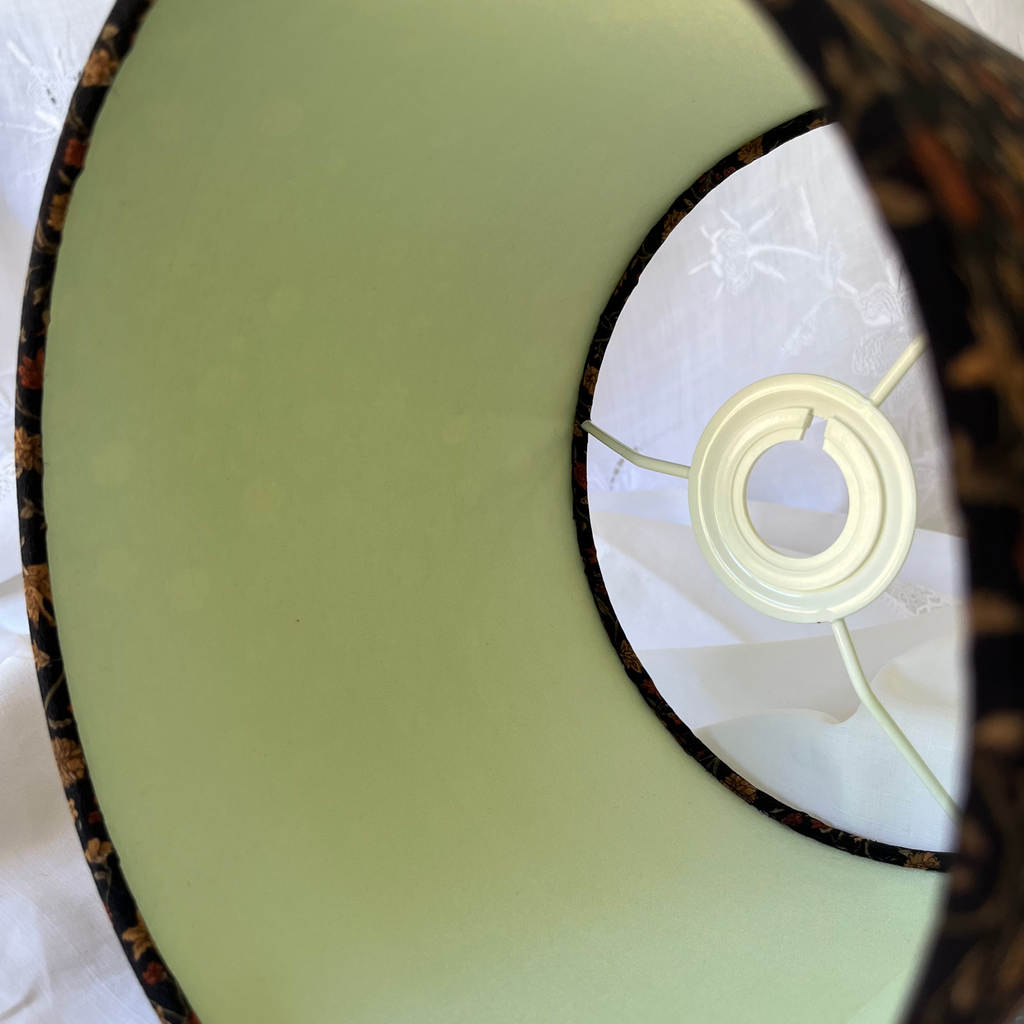 Lovely sapphire, rust, and olive tones on this silk floral shade. Lined with a contrasting pistachio coloured silk.